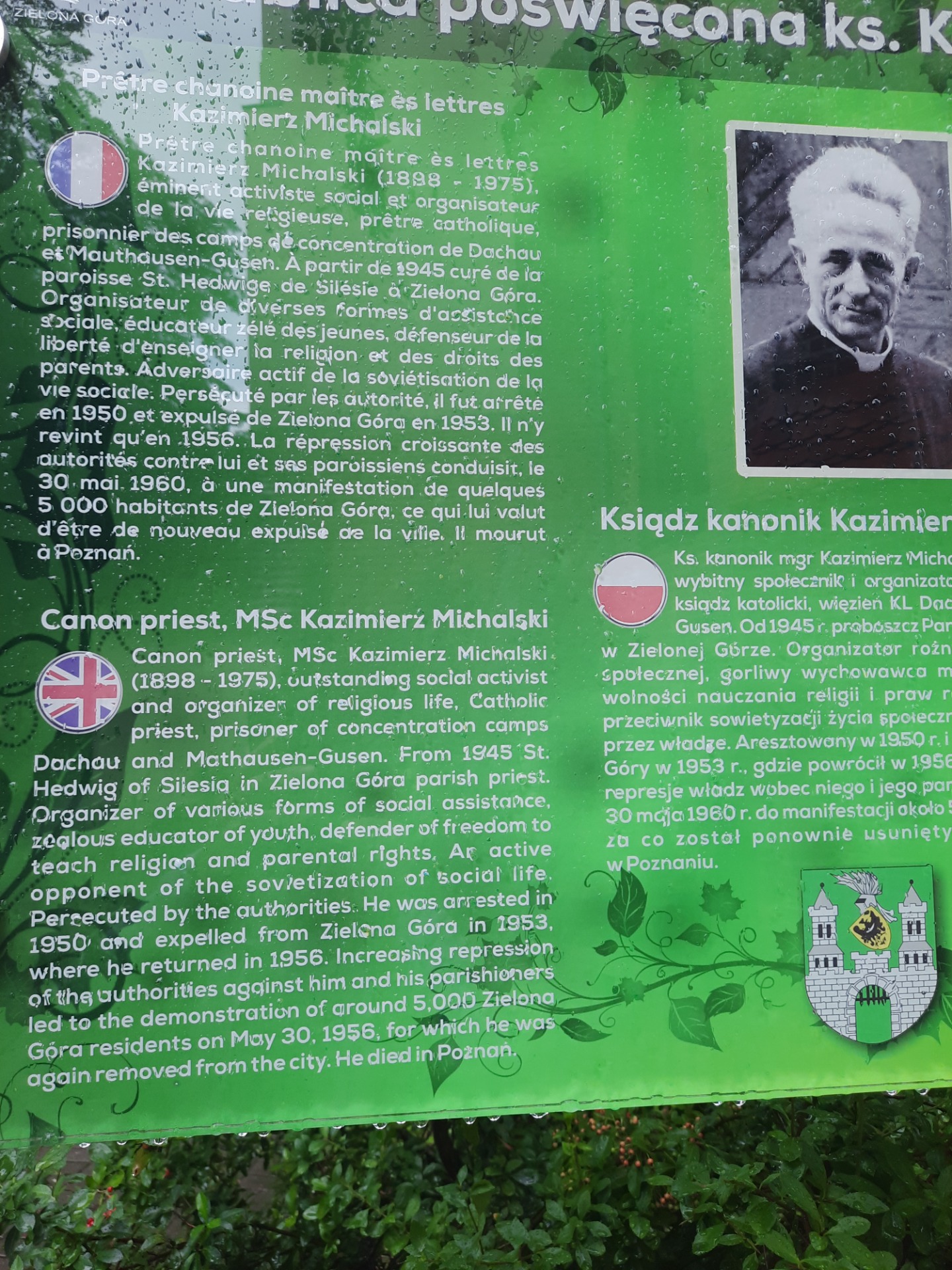 Den første polske præst efter 2. verdenskrig var og blev helt speciel. Han kæmpede i begyndelsen af krigen mod tyskerne, blev fanget og sad i 5 år i koncentrationslejr i Dachau. Efter krigen blev han dygtig præst og organisator for den katolske kirke - MEN kritiker af sovjetstyrets holdninger, hvorfor han blev fjernet fra stillingen i 1953 - vendte tilbage i 1956 - dog kun for atter at blive fjernet senere helt fra byen og præstestillingen, selvom 5000 borgere protesterede!